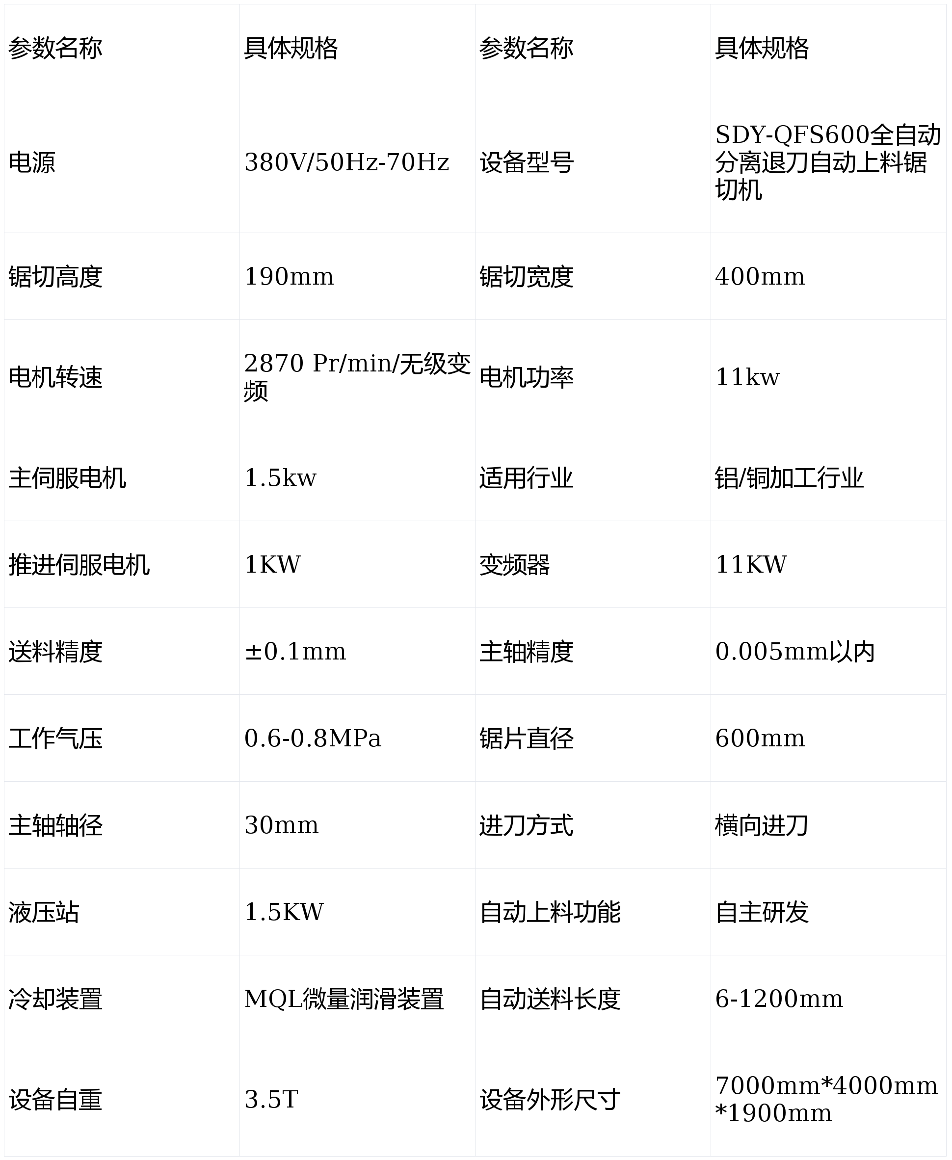 以下為SDY-QFS600全自動上料鋸切機核心參數,方便企業按需匹配: